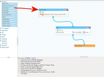 Next get a Yahoo account and go to Yahoo Pipes. Click Create a Pipe to open the interface. In the sidebar click Source and from drop down list drag and drop a Fetch Feed module onto the Interface. In the Fetch Feed module paste the URL for the blog feed shown in above step. See Picture below