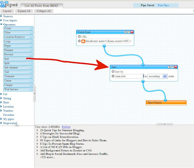 Open the pipe by clicking the link above. Click Clone link at top and a copy of this pipe will be added to your Yahoo Pipes. Click Edit Source link and it will open in your interface just as shown in above diagrams. Then in the Fetch Feed Module paste in your Blog Feed url as shown in first step and you have your own pipe. Save it with your own title/name. Click Run Pipe and you will see the output of all posts sorted alphabetically from your blog.